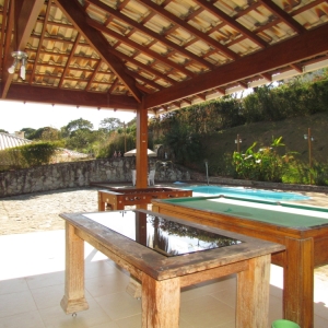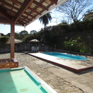 Área externa com garagem para 02 carros que tem utilização como área gourmet e piscina.